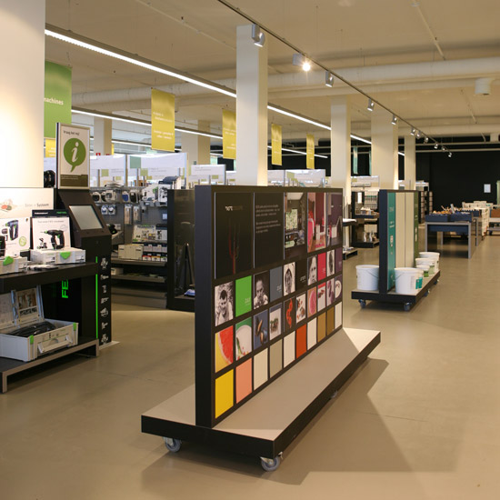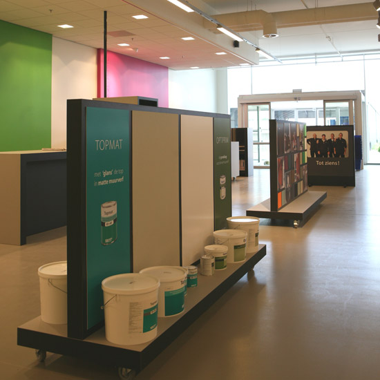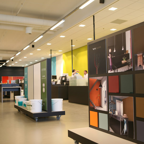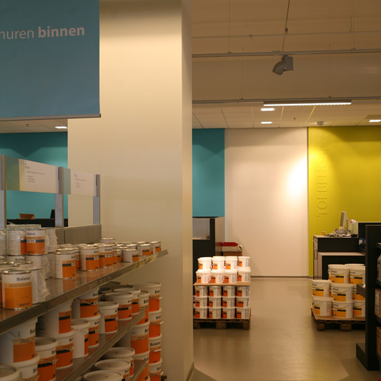 Het assortiment is ingedeeld in vier productgroepen: verf, verftoebehoren, machines en decoratie. Alle producten staan opgesteld in overzichtelijke gondels. Op de kopse kanten van de gondels wordt een wisselend aanbod van nieuwe producten, seizoenproducten en bijbehorende uitleg zichtbaar gemaakt. De koffiecorner is de ideale plaats om bij te praten met een collegaschilder of even wat documentatie door te nemen. Door het depot loopt een centrale inspiratiezone, waar trends en nieuwigheden op een creatieve manier worden voorgesteld. Ze leveren de inspiratie voor de schilder voor toepassingen bij hun klanten.